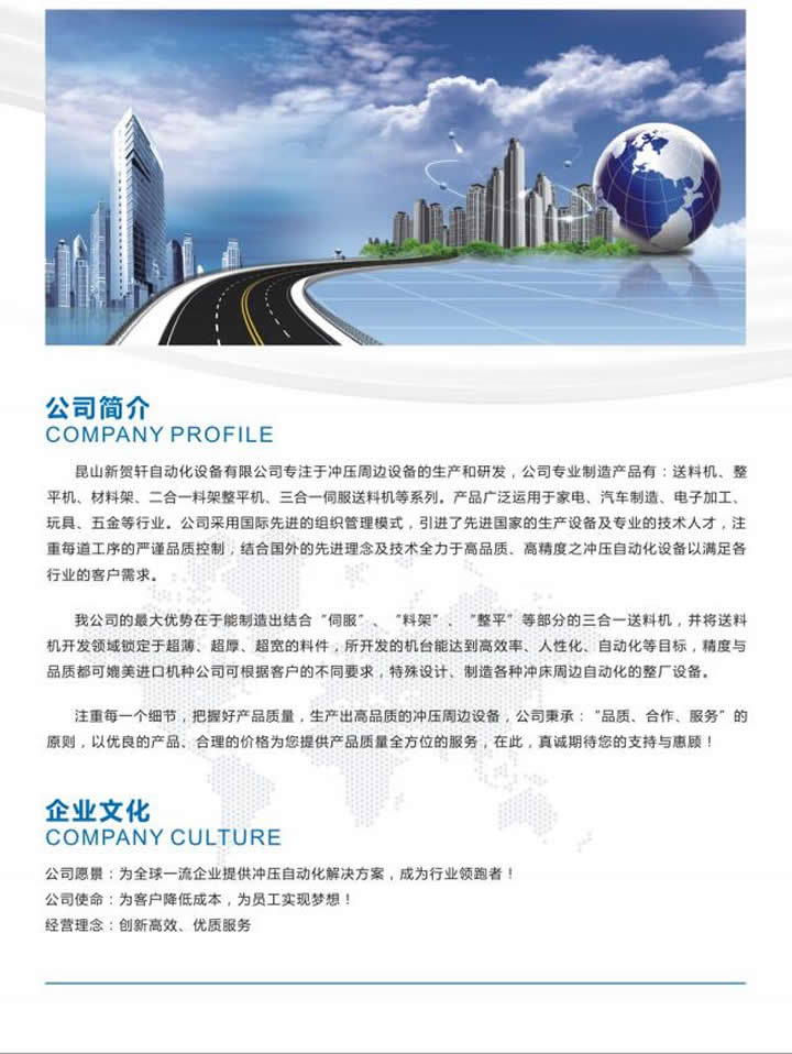 ——昆山新贺轩自动化设备有限公司——我司为冲床自动化全套周边设备 销售、服务、设计、制造专业厂商。主营:送料机系列、矫正机系列、材料架系列、二合一送料机系列、三合一送料机系列、高速冲床配置系其他系列、机械手系列、振动盘系列。
